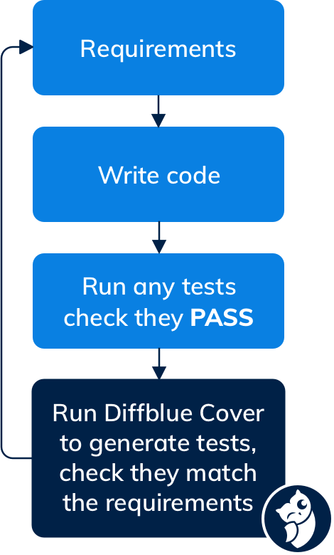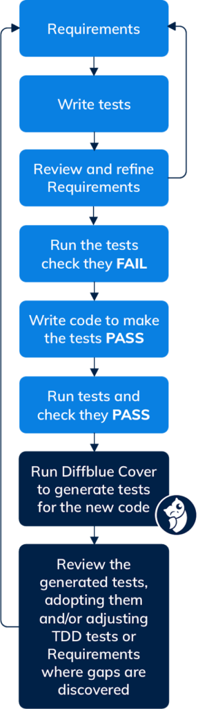 With Diffblue Cover, unit tests are written automatically from the existing code. Of course, the developer still needs to understand the requirements and think about appropriate designs, but now much of the more tedious parts of constructing unit tests is performed automatically. The developer can now look at the tests written by Diffblue Cover and see if they match the requirements—if they don’t, then the focus shifts to refining the code. The workflow then ends up looking something like this: