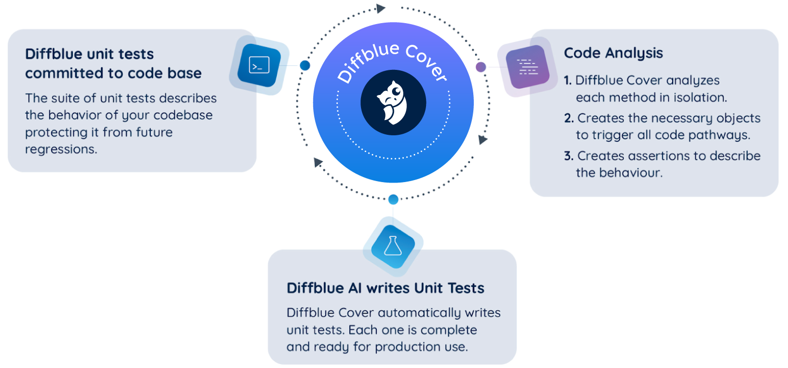 Diffblue Cover uses a method of AI machine learning called reinforcement learning to solve the problem of poor unit test coverage and test failures by autonomously creating and updating unit test suites for Java application development. It enables developers and development teams to catch regressions and unplanned behavior changes more comprehensively than any manual process.