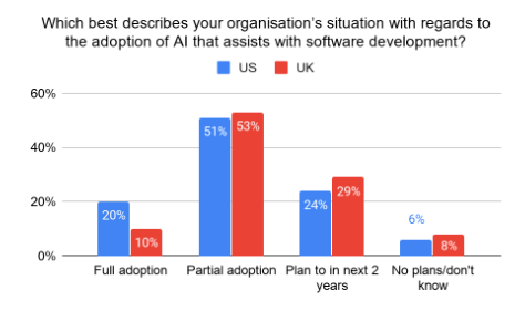 Survey responses indicate the rate of full organization adoption of AI for software development in the US is double the rate of the UK (see figure below), while partial adoption rates are about even. In terms of future forecasting, a majority of US developers (53%) strongly expect to use AI to improve productivity within the software engineering team by 2025, compared to 31% of UK developers.